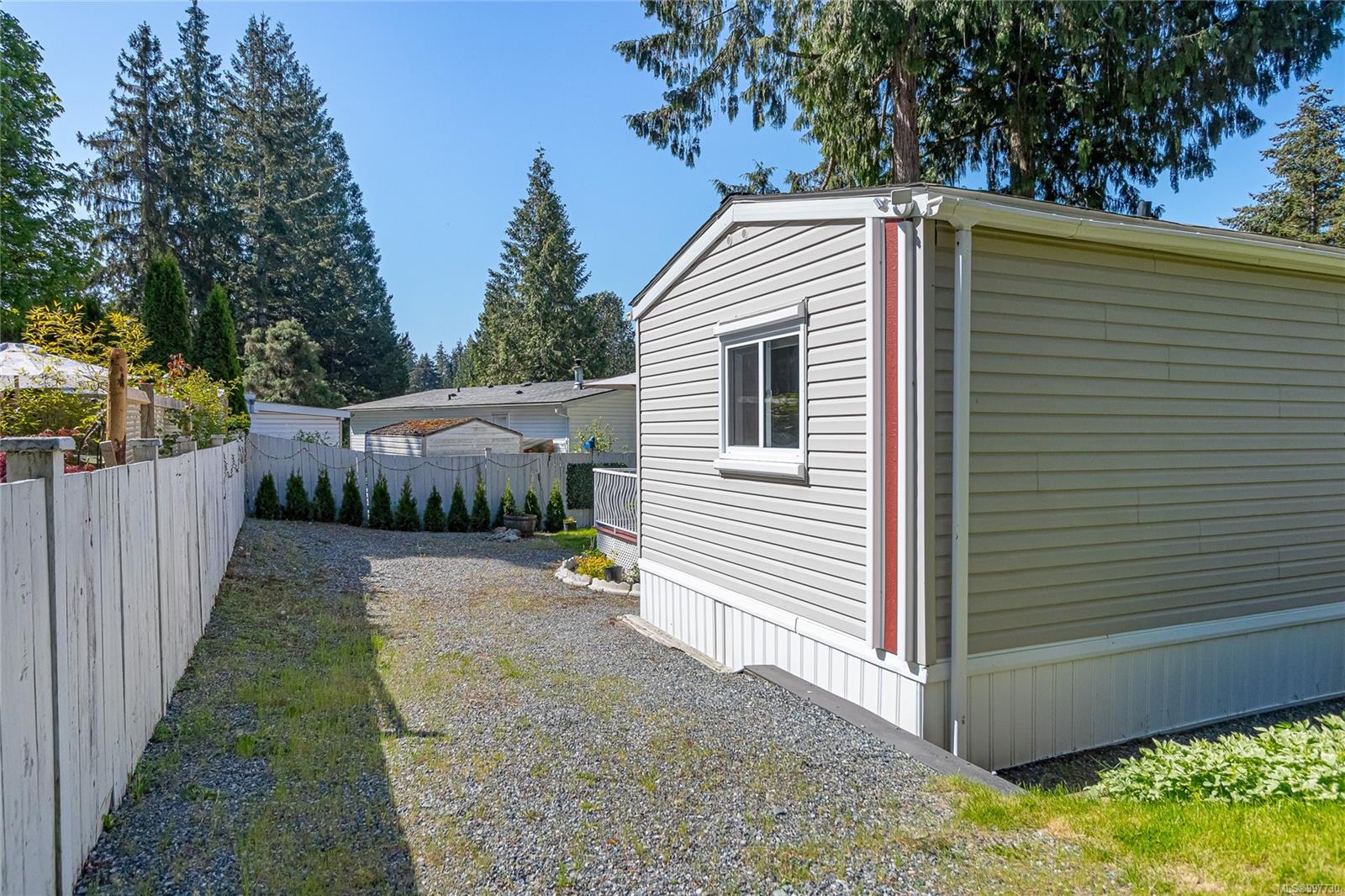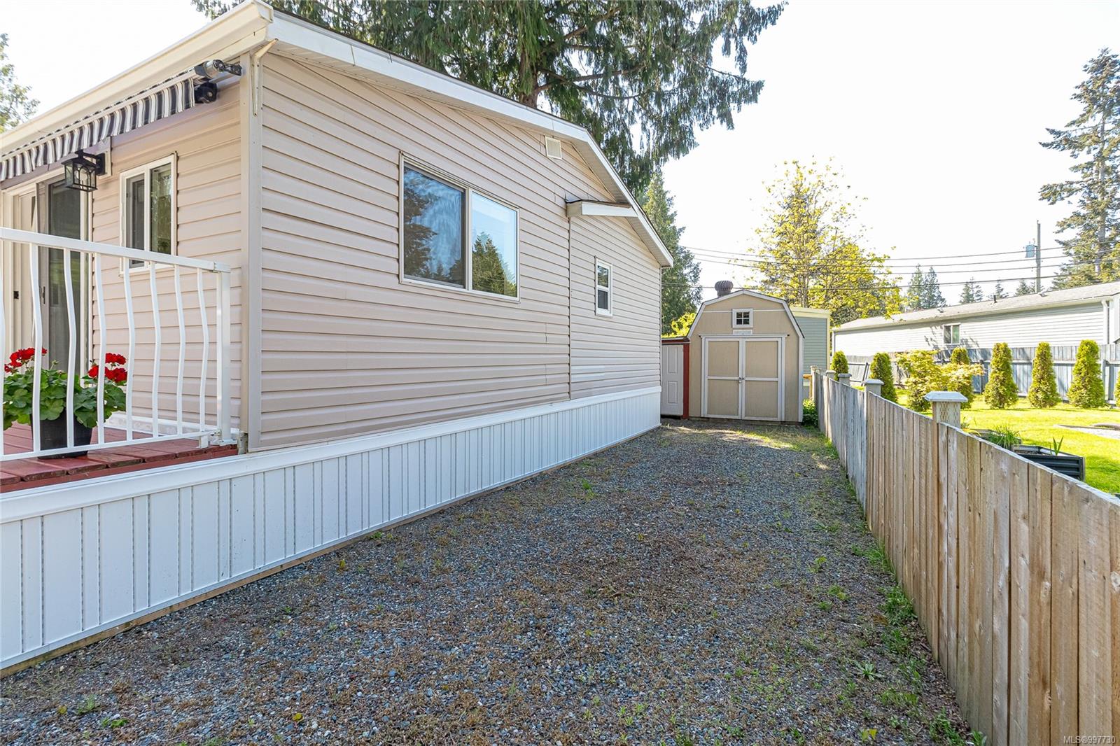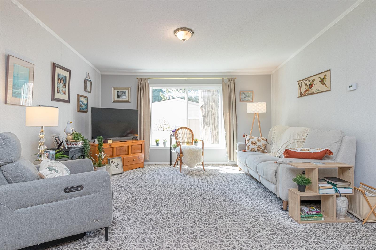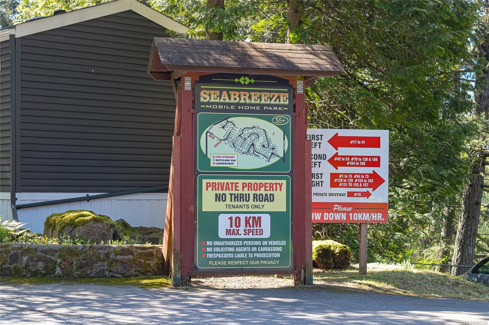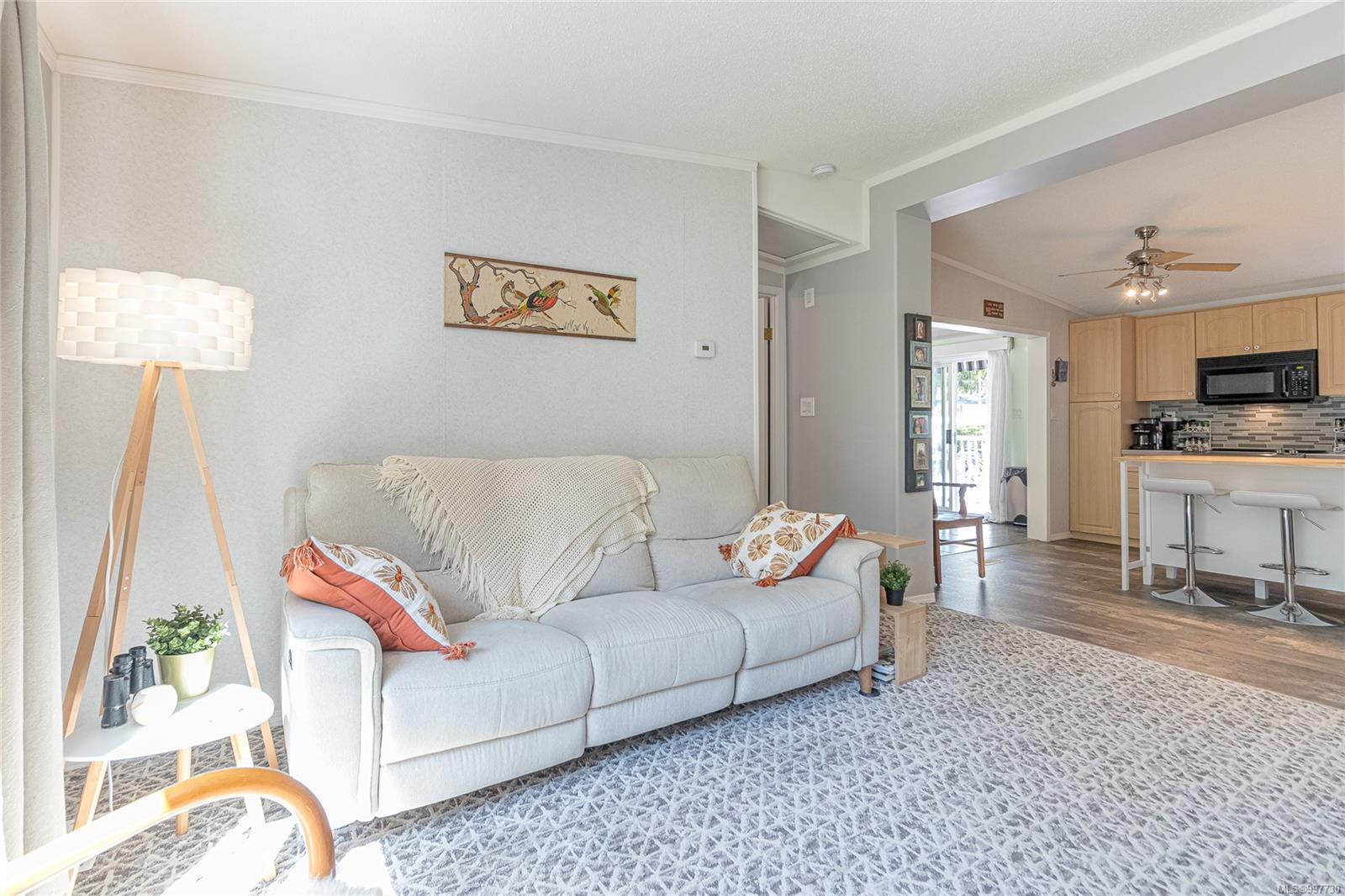 Welcome to this bright and well-maintained 2-bedroom, 2-bath offset double-wide home with a professionally constructed addition, located in the popular 55+ Seabreeze Mobile Home Park. This spacious home features an open-concept layout with vaulted ceilings in the main living area, creating an airy and inviting atmosphere. The kitchen is a standout with an eating island, tile backsplash, and ample cabinetry. On one end of the home, the primary suite includes a walk-in closet and full ensuite with a shower-tub combo. On the opposite end, you’ll find the second bedroom and a separate 4-piece bath—ideal for guests or added privacy. Enjoy the morning sun on the deck or unwind on the private patio in the afternoon. The yard is a beautifully landscaped with a small grassy area, mature trees, and two garden sheds. Just a short walk to Country Grocer, Southgate Mall, and other amenities—this home offers affordable, comfortable, and convenient living in a peaceful setting. All measurements are approximate & should be verified if important.