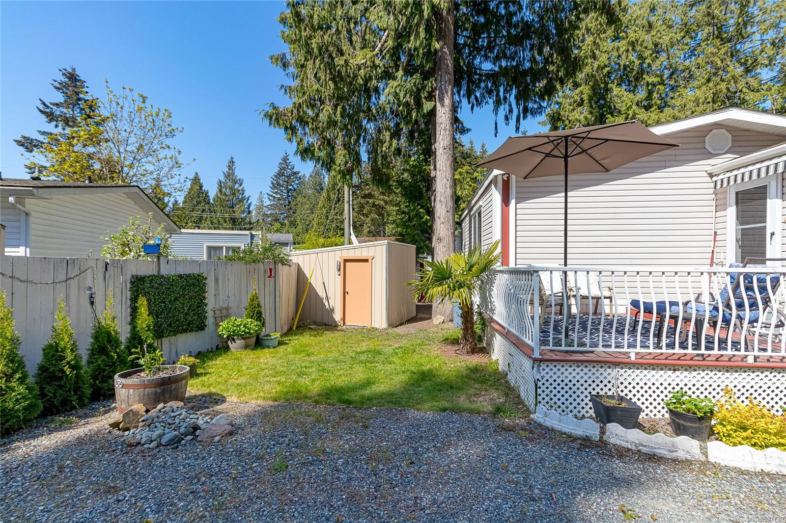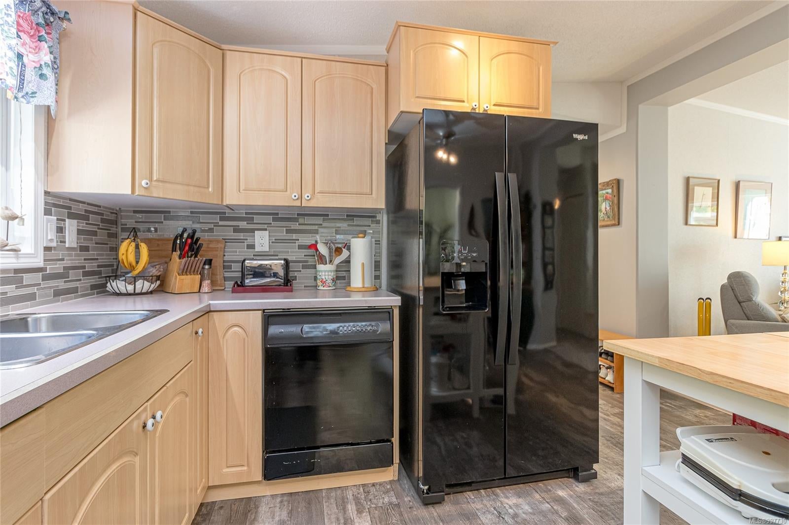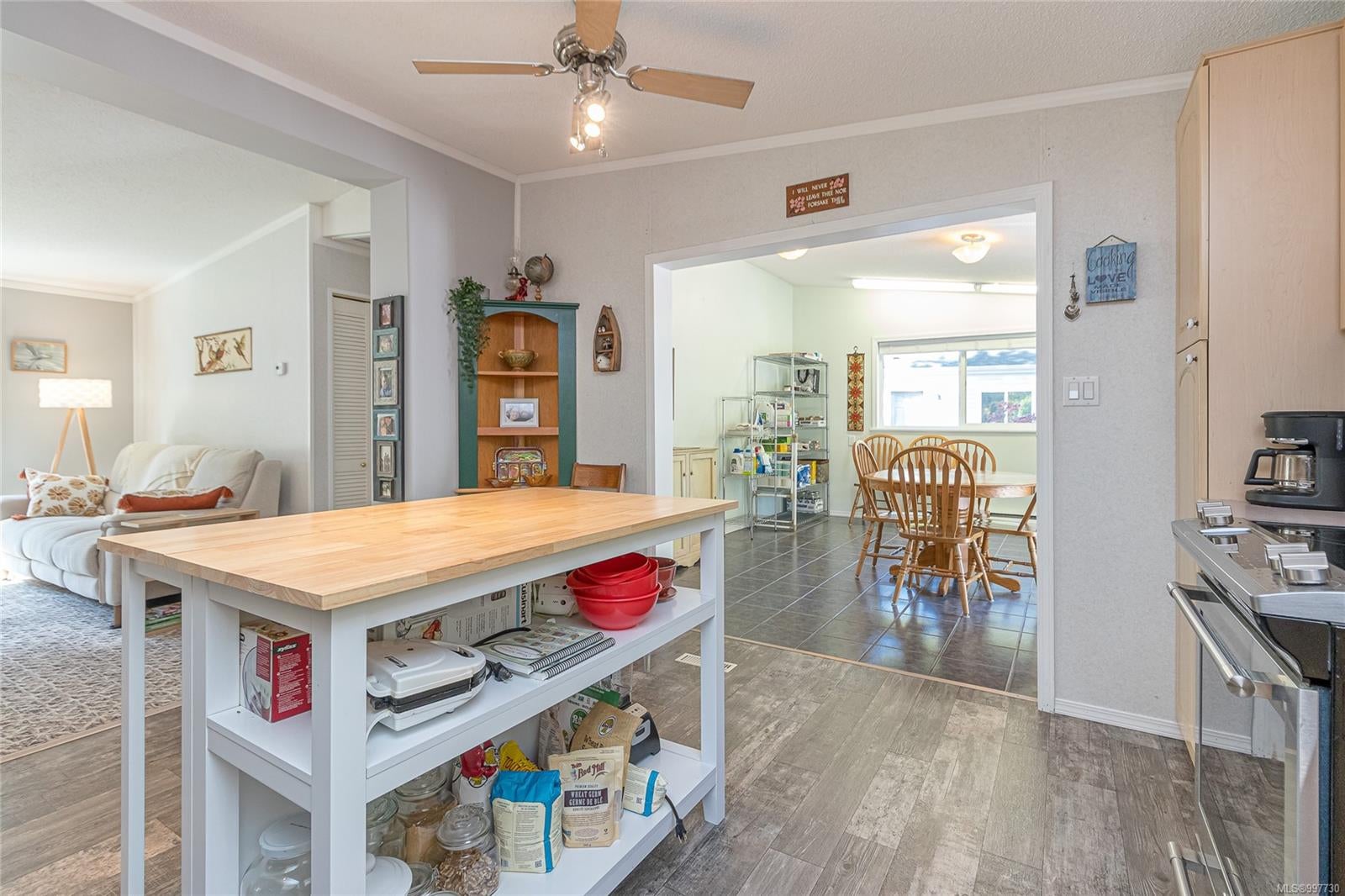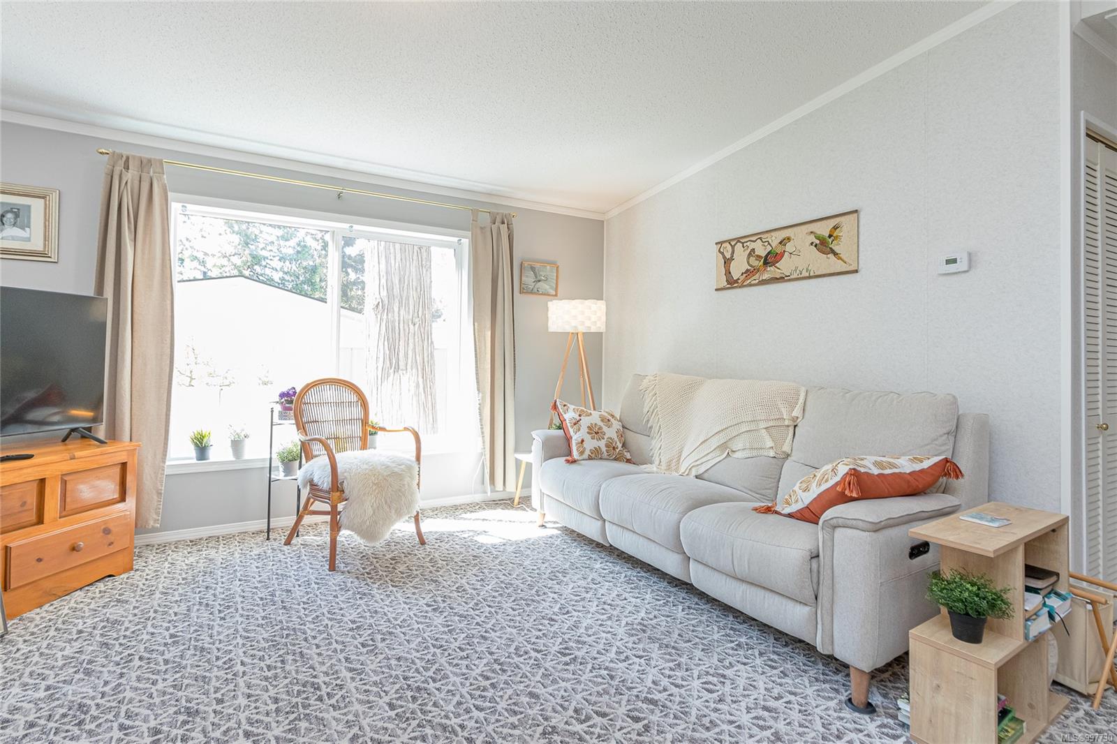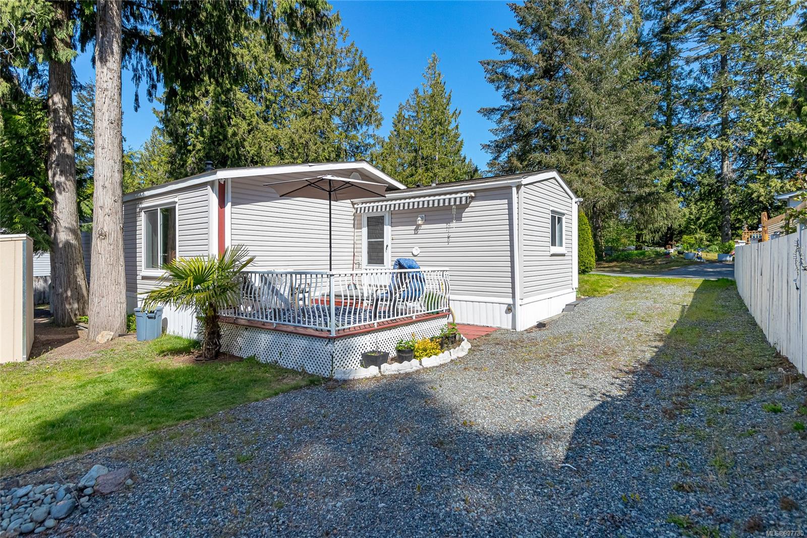 Welcome to this bright and well-maintained 2-bedroom, 2-bath offset double-wide home with a professionally constructed addition, located in the popular 55+ Seabreeze Mobile Home Park. This spacious home features an open-concept layout with vaulted ceilings in the main living area, creating an airy and inviting atmosphere. The kitchen is a standout with an eating island, tile backsplash, and ample cabinetry. On one end of the home, the primary suite includes a walk-in closet and full ensuite with a shower-tub combo. On the opposite end, you’ll find the second bedroom and a separate 4-piece bath—ideal for guests or added privacy. Enjoy the morning sun on the deck or unwind on the private patio in the afternoon. The yard is a beautifully landscaped with a small grassy area, mature trees, and two garden sheds. Just a short walk to Country Grocer, Southgate Mall, and other amenities—this home offers affordable, comfortable, and convenient living in a peaceful setting. All measurements are approximate & should be verified if important.