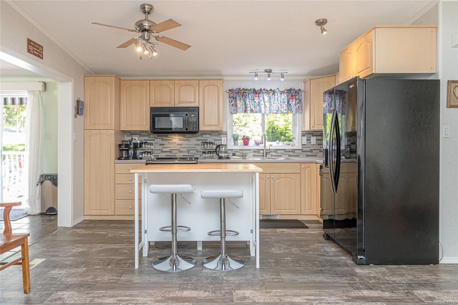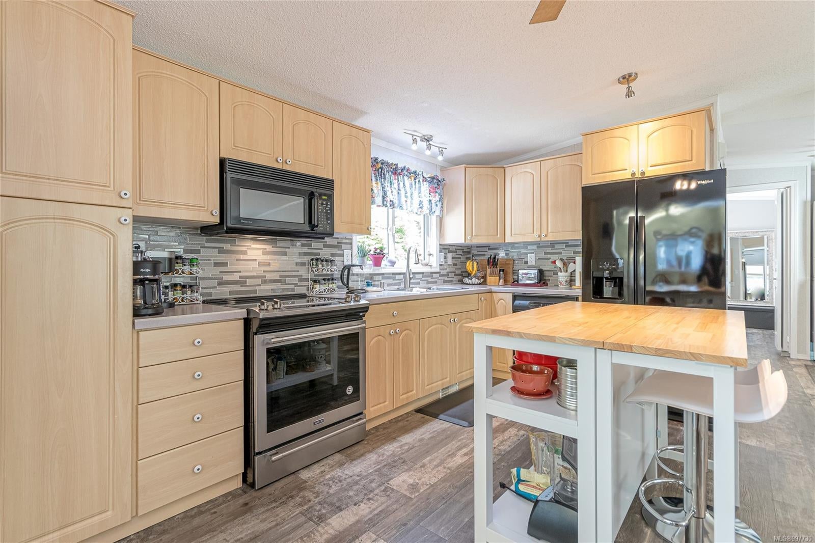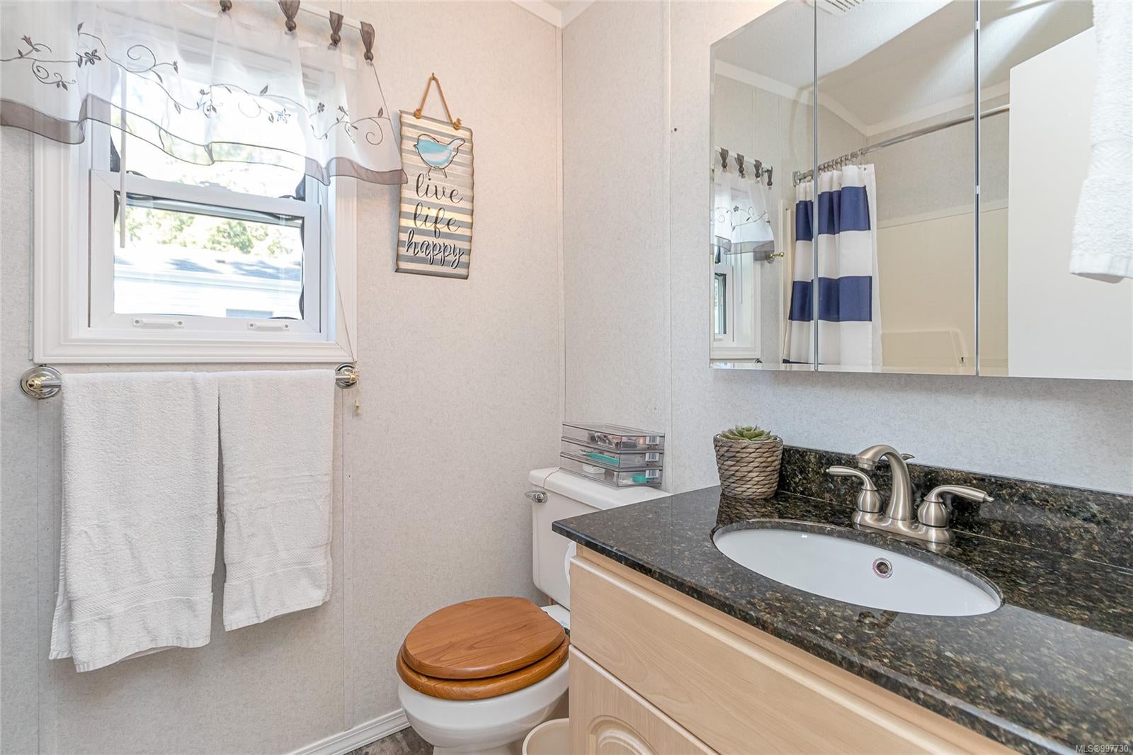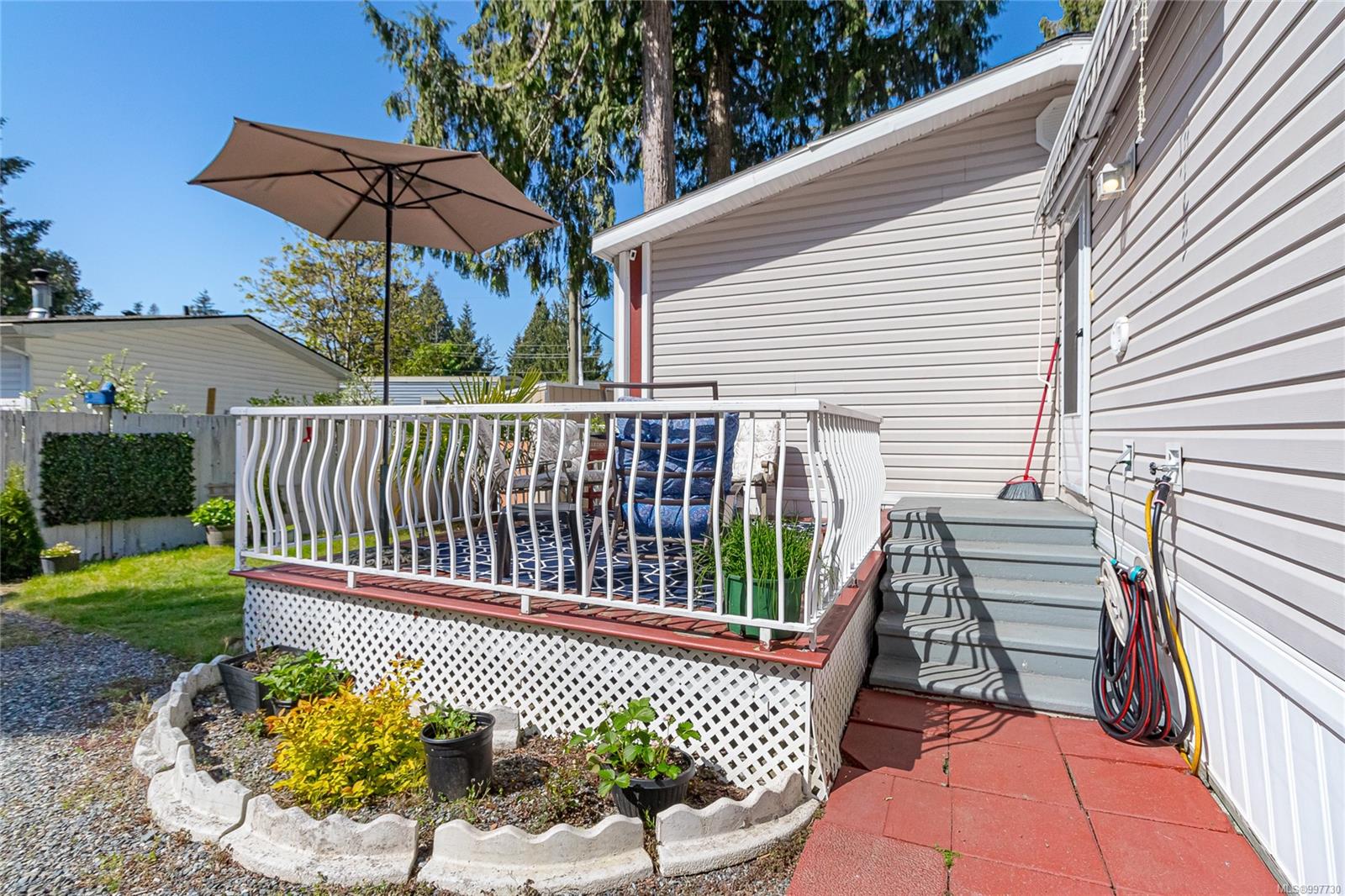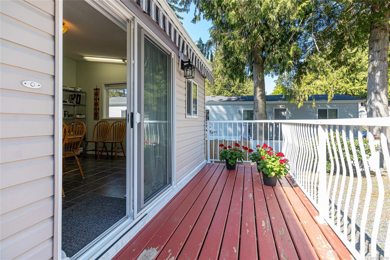 Welcome to this bright and well-maintained 2-bedroom, 2-bath offset double-wide home with a professionally constructed addition, located in the popular 55+ Seabreeze Mobile Home Park. This spacious home features an open-concept layout with vaulted ceilings in the main living area, creating an airy and inviting atmosphere. The kitchen is a standout with an eating island, tile backsplash, and ample cabinetry. On one end of the home, the primary suite includes a walk-in closet and full ensuite with a shower-tub combo. On the opposite end, you’ll find the second bedroom and a separate 4-piece bath—ideal for guests or added privacy. Enjoy the morning sun on the deck or unwind on the private patio in the afternoon. The yard is a beautifully landscaped with a small grassy area, mature trees, and two garden sheds. Just a short walk to Country Grocer, Southgate Mall, and other amenities—this home offers affordable, comfortable, and convenient living in a peaceful setting. All measurements are approximate & should be verified if important.