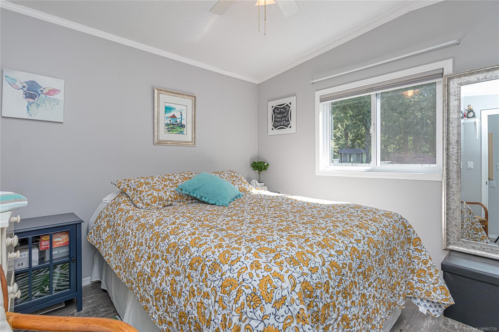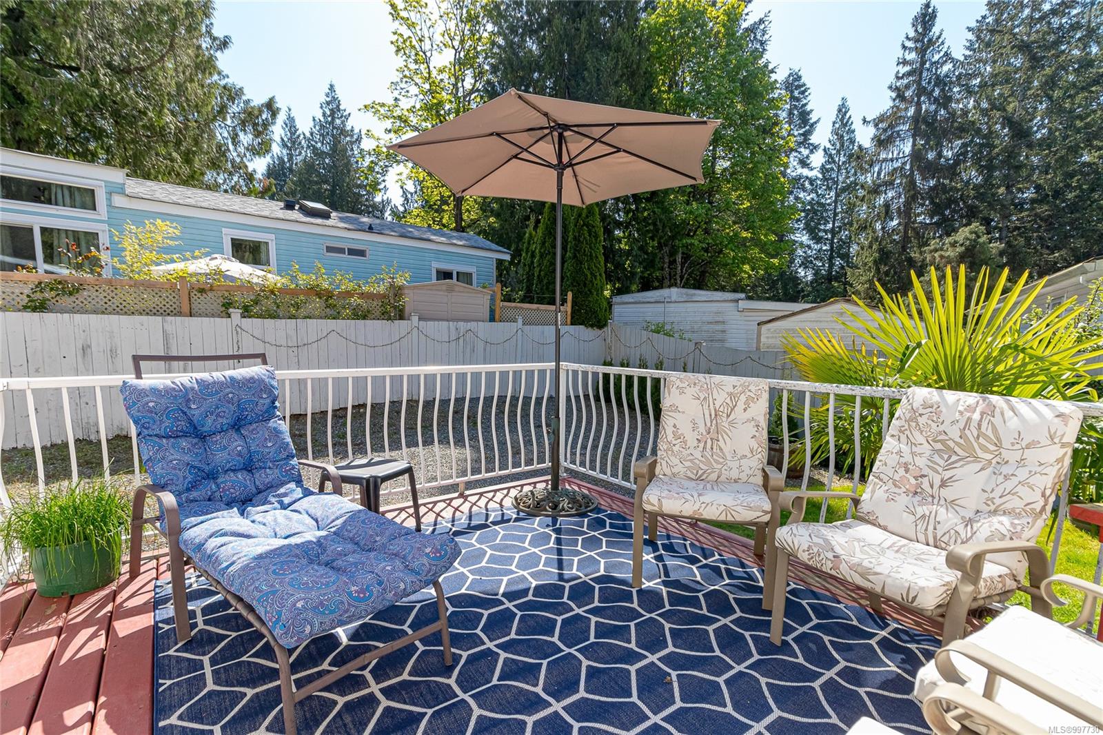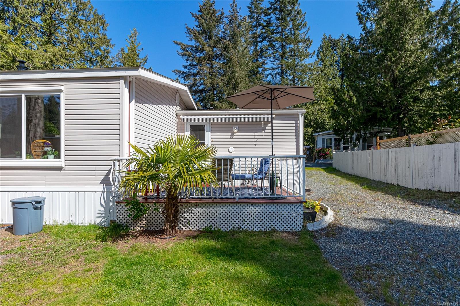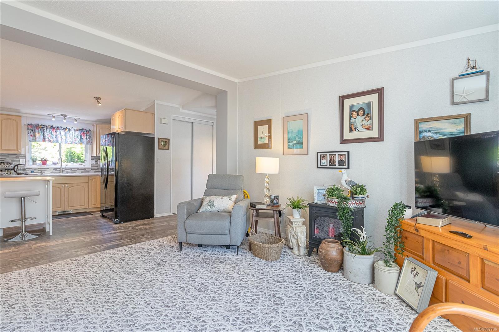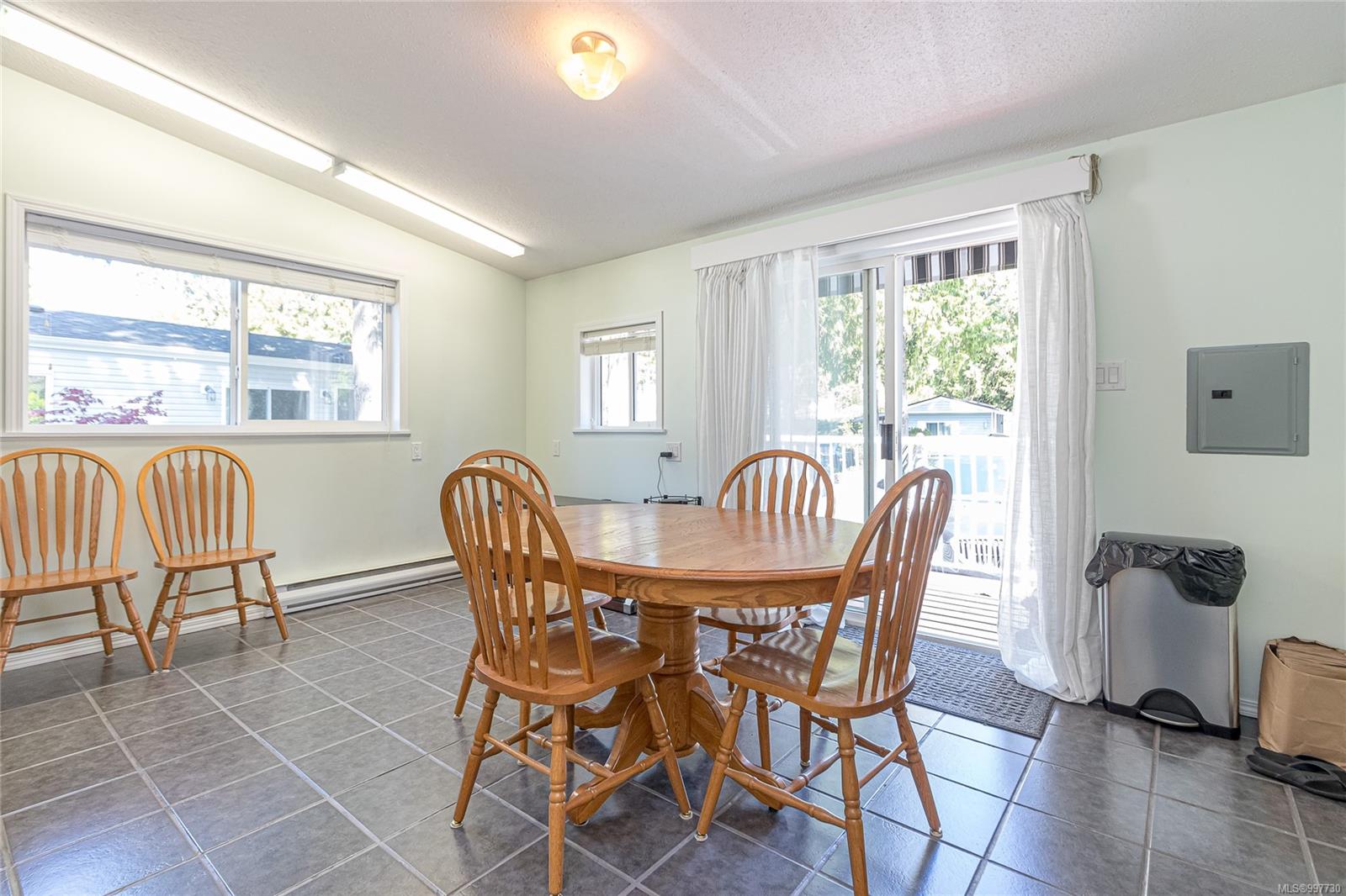 Welcome to this bright and well-maintained 2-bedroom, 2-bath offset double-wide home with a professionally constructed addition, located in the popular 55+ Seabreeze Mobile Home Park. This spacious home features an open-concept layout with vaulted ceilings in the main living area, creating an airy and inviting atmosphere. The kitchen is a standout with an eating island, tile backsplash, and ample cabinetry. On one end of the home, the primary suite includes a walk-in closet and full ensuite with a shower-tub combo. On the opposite end, you’ll find the second bedroom and a separate 4-piece bath—ideal for guests or added privacy. Enjoy the morning sun on the deck or unwind on the private patio in the afternoon. The yard is a beautifully landscaped with a small grassy area, mature trees, and two garden sheds. Just a short walk to Country Grocer, Southgate Mall, and other amenities—this home offers affordable, comfortable, and convenient living in a peaceful setting. All measurements are approximate & should be verified if important.