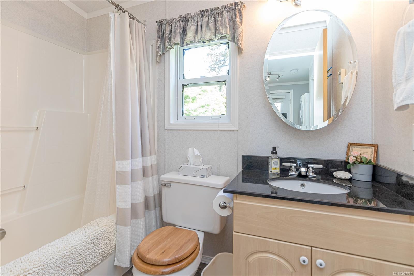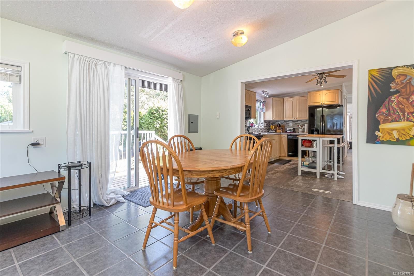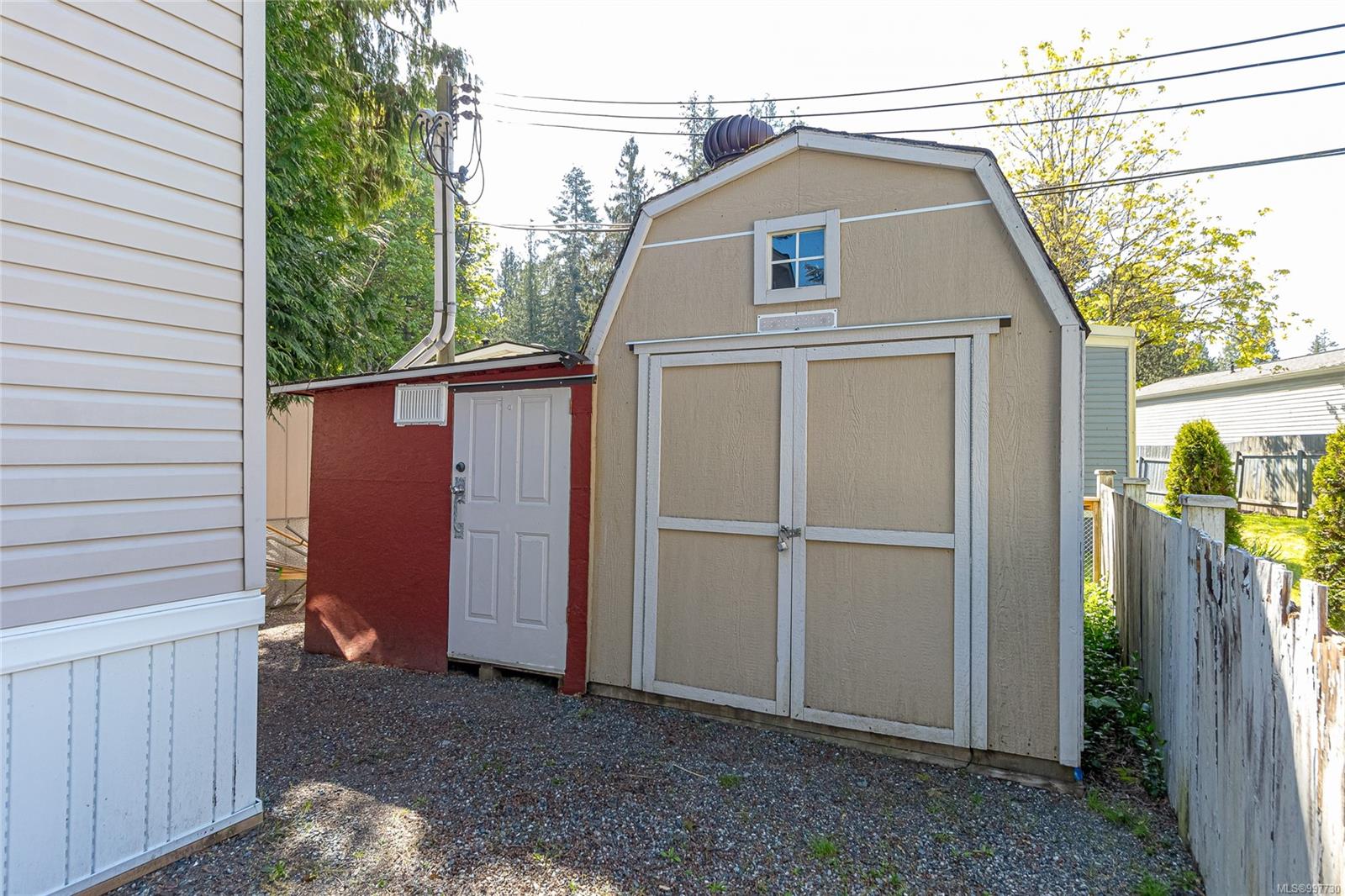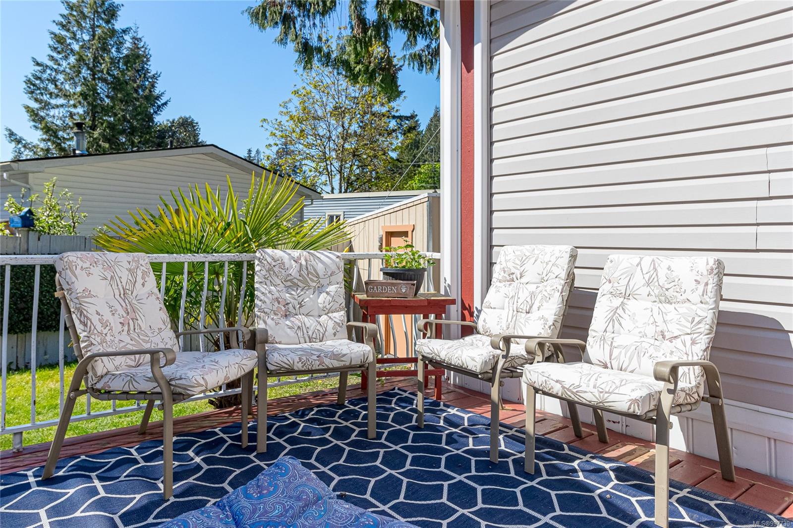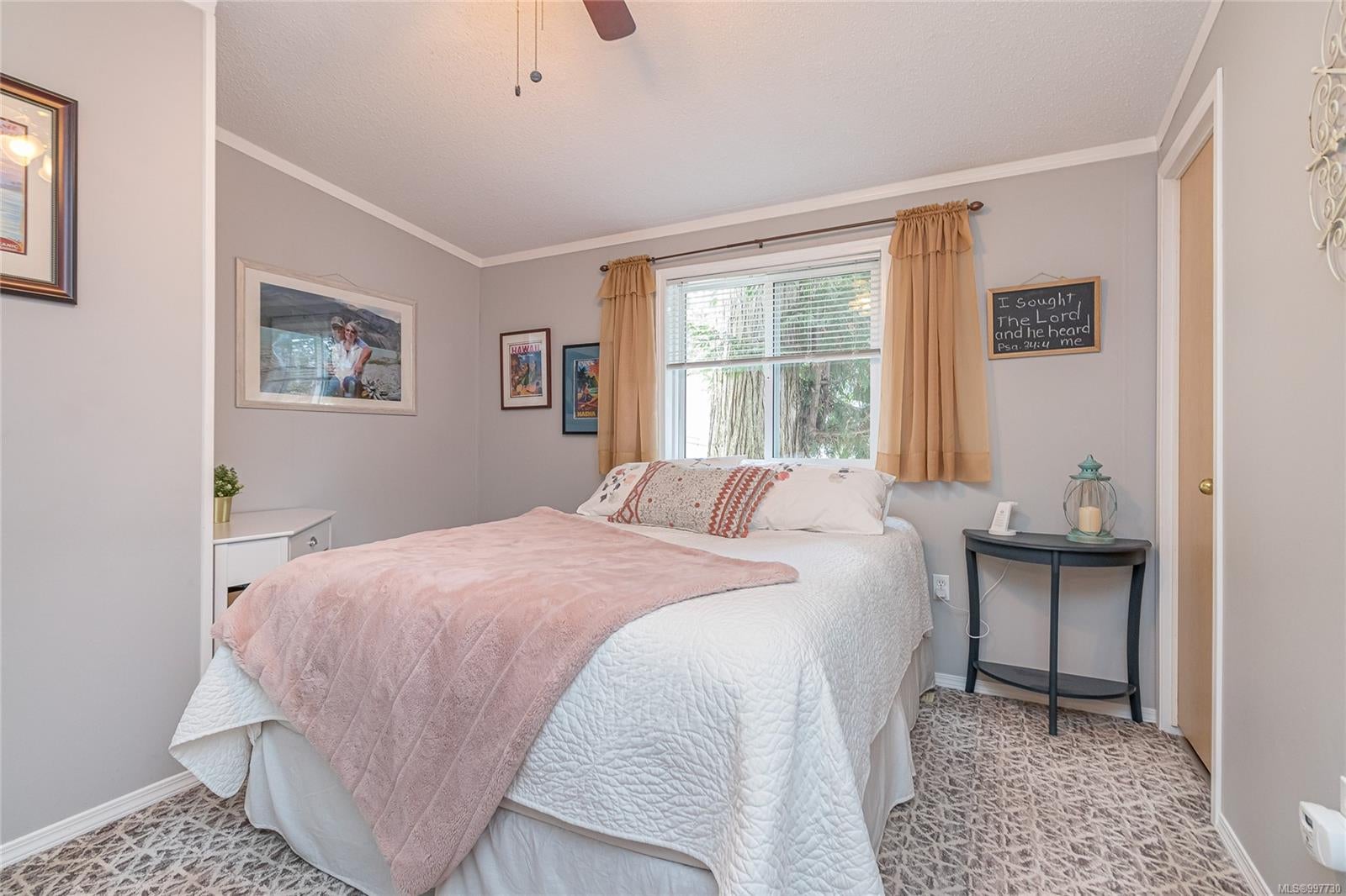 Welcome to this bright and well-maintained 2-bedroom, 2-bath offset double-wide home with a professionally constructed addition, located in the popular 55+ Seabreeze Mobile Home Park. This spacious home features an open-concept layout with vaulted ceilings in the main living area, creating an airy and inviting atmosphere. The kitchen is a standout with an eating island, tile backsplash, and ample cabinetry. On one end of the home, the primary suite includes a walk-in closet and full ensuite with a shower-tub combo. On the opposite end, you’ll find the second bedroom and a separate 4-piece bath—ideal for guests or added privacy. Enjoy the morning sun on the deck or unwind on the private patio in the afternoon. The yard is a beautifully landscaped with a small grassy area, mature trees, and two garden sheds. Just a short walk to Country Grocer, Southgate Mall, and other amenities—this home offers affordable, comfortable, and convenient living in a peaceful setting. All measurements are approximate & should be verified if important.