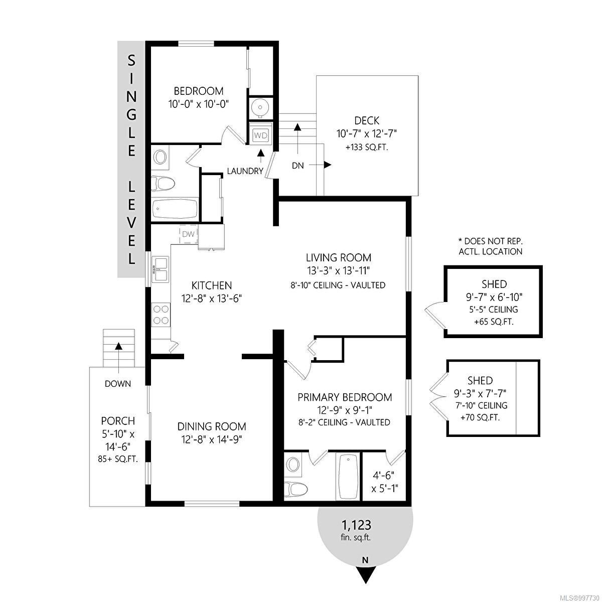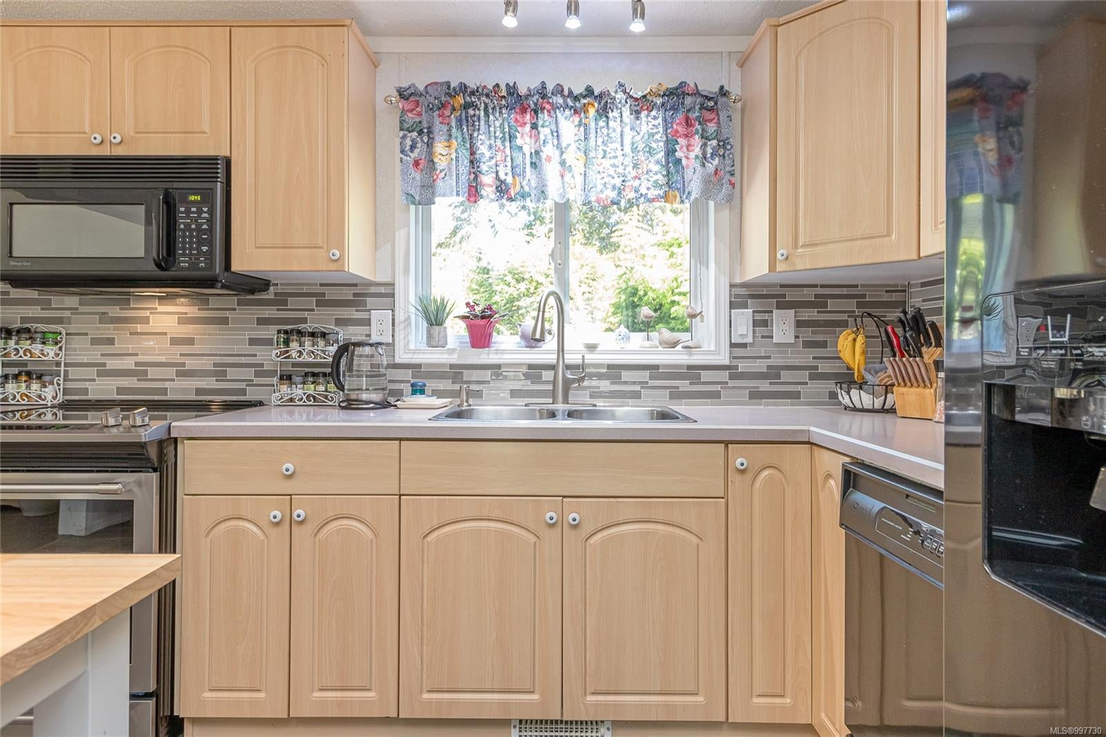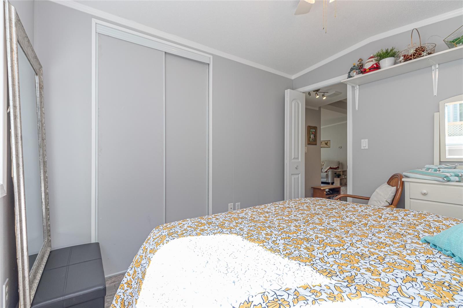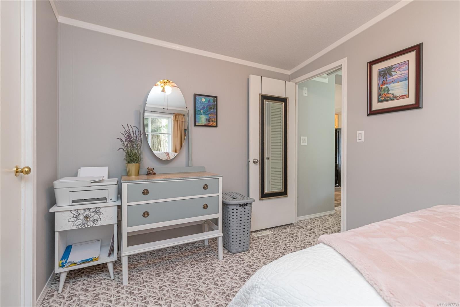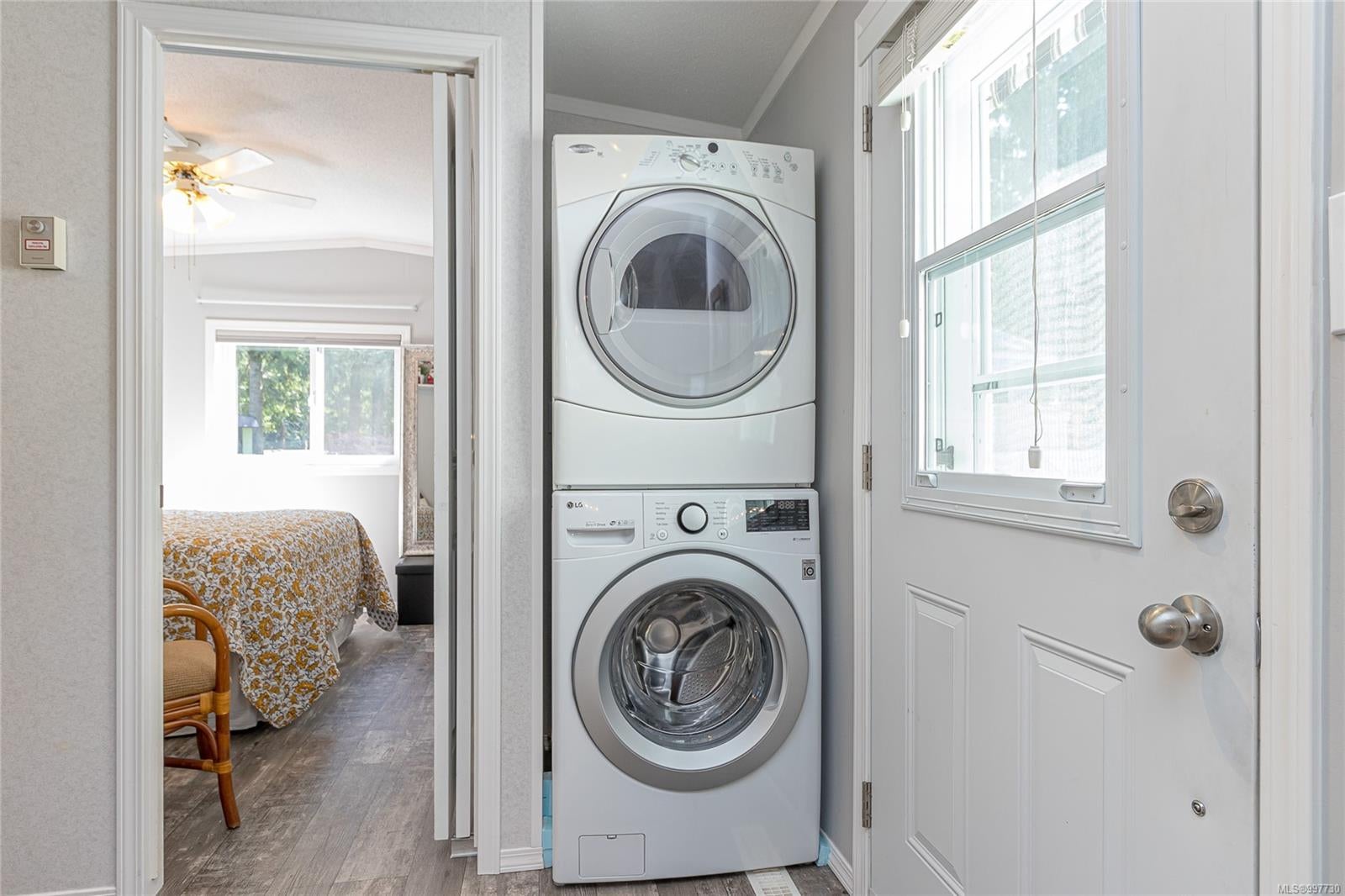 Welcome to this bright and well-maintained 2-bedroom, 2-bath offset double-wide home with a professionally constructed addition, located in the popular 55+ Seabreeze Mobile Home Park. This spacious home features an open-concept layout with vaulted ceilings in the main living area, creating an airy and inviting atmosphere. The kitchen is a standout with an eating island, tile backsplash, and ample cabinetry. On one end of the home, the primary suite includes a walk-in closet and full ensuite with a shower-tub combo. On the opposite end, you’ll find the second bedroom and a separate 4-piece bath—ideal for guests or added privacy. Enjoy the morning sun on the deck or unwind on the private patio in the afternoon. The yard is a beautifully landscaped with a small grassy area, mature trees, and two garden sheds. Just a short walk to Country Grocer, Southgate Mall, and other amenities—this home offers affordable, comfortable, and convenient living in a peaceful setting. All measurements are approximate & should be verified if important.