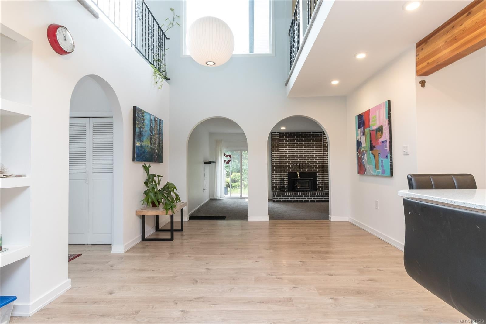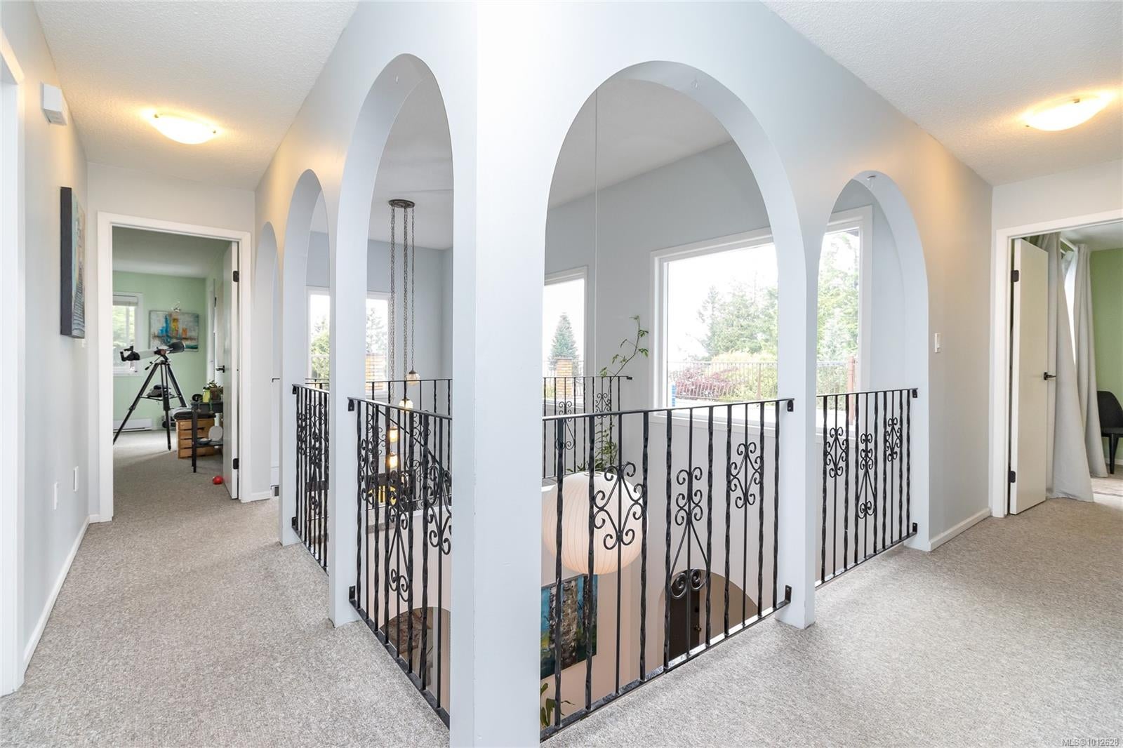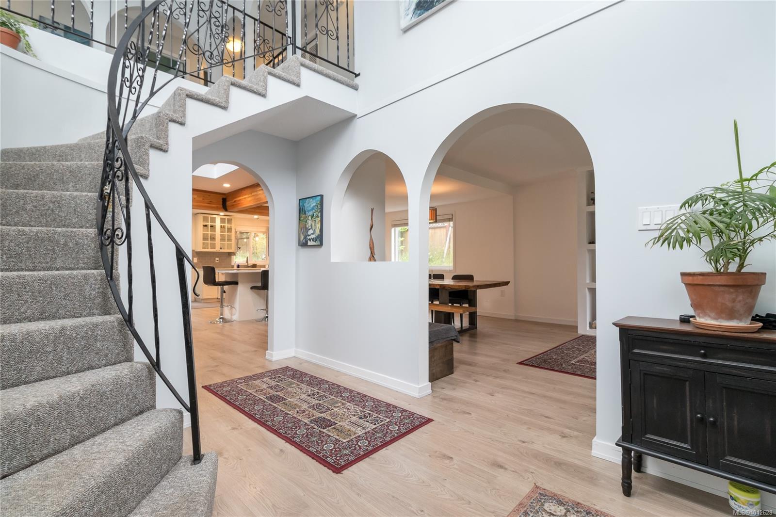 Perched on a quiet cul-de-sac in North Nanaimo, this stunning family home on a .35-acre corner lot offers the perfect blend of nature, space, and style. With ocean and mountain views, this 4-bedroom, 3-bathroom home is ideal for those seeking both tranquility and convenience. Inside, a bright, open-concept layout combines contemporary finishing with classic Spanish architectural details, including arched doorways, a winding staircase with wrought iron railings, and modern tasteful updates throughout. The renovated kitchen flows seamlessly into the main living area, anchored by a cozy gas fireplace, while a wood-burning fireplace adds warmth to the spacious family room. Upstairs, four generous bedrooms include a private primary suite with a walk-in closet and 3-piece ensuite. Outside, the fully fenced backyard features garden beds and a patio ideal for entertaining or relaxing summer evenings, serenaded by frogs and the distant call of owls. With a double garage, two driveways and ample parking for a boat or RV, this home is as practical as it is picturesque. Additional features include hot water on demand, a fully fenced landscaped lot, and a location that is mere steps to Lost Lake Trail and Linley Valley’s scenic walking, biking, and hiking paths. This is more than a home—it’s a lifestyle inspired by nature, comfort, and timeless design. Make your appointment to view this one-of-a-kind home today before it is gone! All measurements are approximate and should be verified if important.